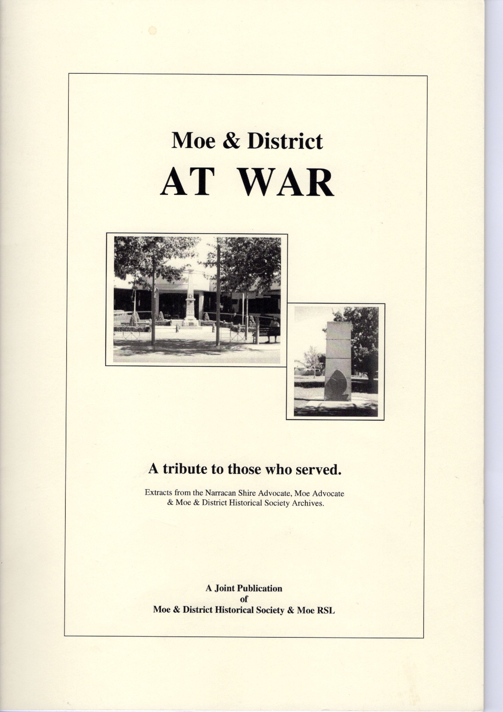 ![]() | “Moe & District at War – A tribute to those who served” – Extracts from the Narracan Shire Advocate, Moe Advocate & Moe & District Historical Society | Moe Historical Society & Moe RSL | $5.00 or $10.00 posted |
